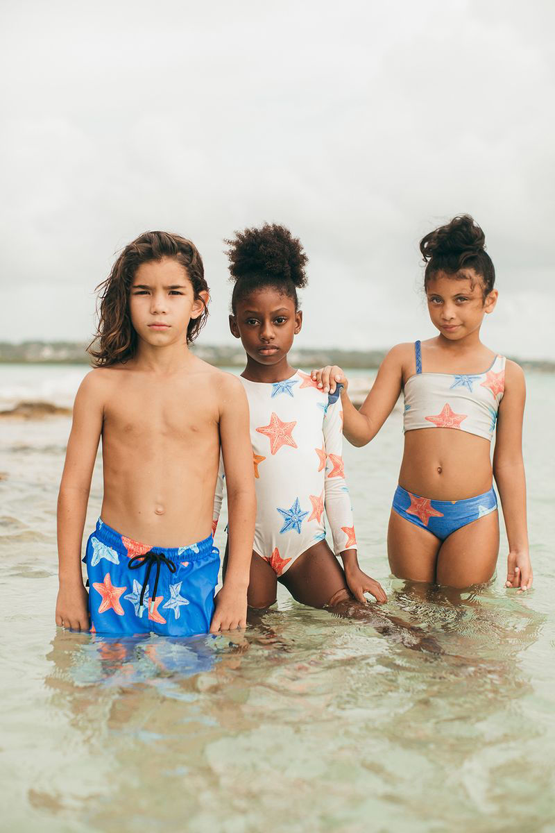 Match with stars swim trucks and dark vichy one piece swimsuit.